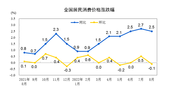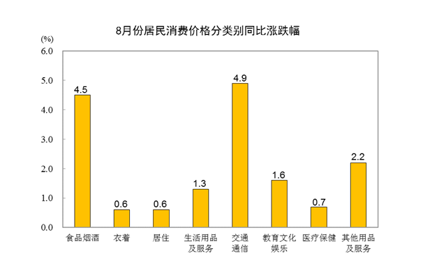 8月份,全國居民消費價格同比上漲2.5%,環(huán)比下降0.1%;居住類價格同比上漲0.6%,環(huán)比持平。1—8月平均,全國居民消費價格比上年同期上漲1.9%。