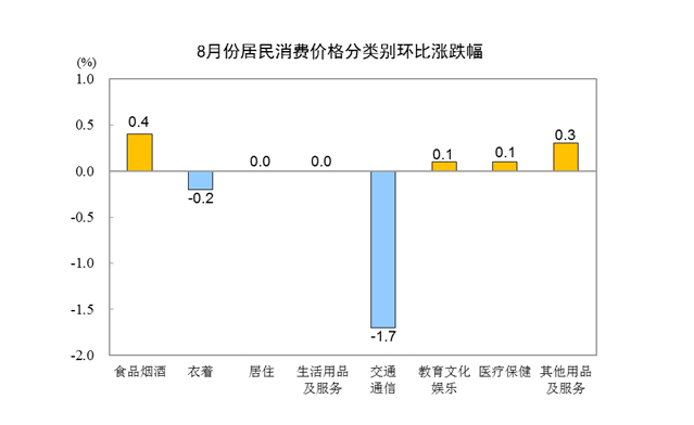 8月份,全國居民消費價格環(huán)比下降0.1%。其中,城市下降0.1%,農(nóng)村下降0.1%;食品價格上漲0.5%,非食品價格下降0.3%;消費品價格下降0.2%,服務(wù)價格持平。