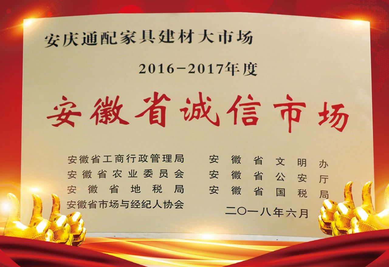 在創(chuàng)建活動中,安慶通配家具建材大市場不斷完善管理措施,健全市場管理制度,加強精神文明建設,做到管理規(guī)范、制度健全、環(huán)境優(yōu)良、文明經營、誠實守信、維護消費者合法權益,營造了良好的市場發(fā)展和經營環(huán)境,由安徽通配集團投資建設的安慶通配家具建材大市場在本次盛會上榮獲2016-2017年度“安徽省誠信市場”榮譽稱號。