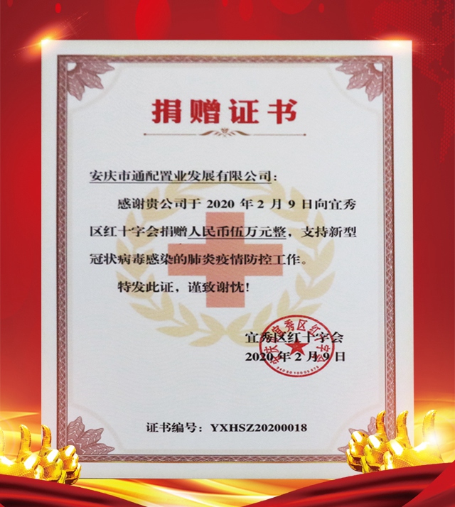 2月9日,通配集團(tuán)向安慶市宜秀區(qū)紅十字會(huì)捐款5萬(wàn)元,全力支持宜秀區(qū)防控新型冠狀病毒感染的肺炎疫情工作。