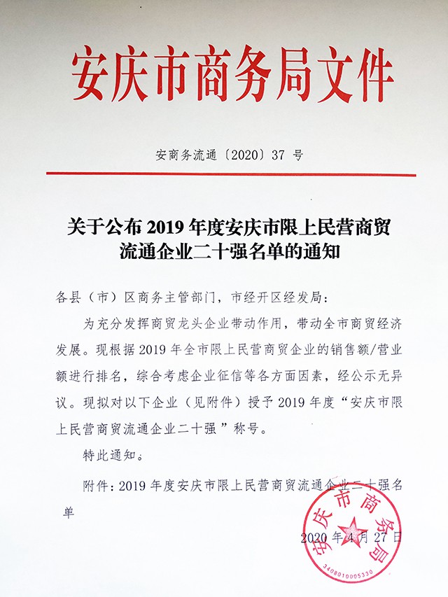 為充分發(fā)揮商貿(mào)龍頭企業(yè)帶動作用,帶動全市商貿(mào)經(jīng)濟發(fā)展,安慶市商務(wù)局根據(jù)2019年全市限上民營商貿(mào)企業(yè)的銷售額/營業(yè)額進行排名,綜合考慮企業(yè)征信等各方面因素,4月27日安慶市商務(wù)局,公布了2019年度“安慶市二十強限上民營商貿(mào)流通企業(yè)”的名單。安慶市通配物資有限公司光榮上榜安慶市“批發(fā)業(yè)五強企業(yè)”,位列榜單第1位,這是安慶市通配物資有限公司榮獲2019年度“安慶市限上民營商貿(mào)流通企業(yè)二十強”榮譽稱號。