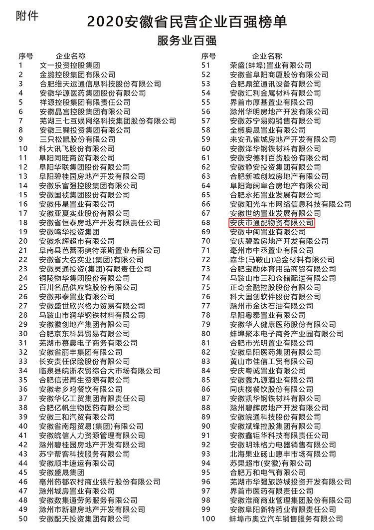 據(jù)悉,榜單按照企業(yè)自愿參與原則,經(jīng)過(guò)審核、評(píng)議等環(huán)節(jié),依據(jù)企業(yè)2019年度主要經(jīng)濟(jì)指標(biāo)確定。確定了2020安徽省民營(yíng)企業(yè)營(yíng)收百?gòu)?qiáng)、制造業(yè)綜合百?gòu)?qiáng)和服務(wù)業(yè)百?gòu)?qiáng)。安慶市通配物資有限公司榮獲2020安徽省“民營(yíng)企業(yè)服務(wù)業(yè)百?gòu)?qiáng)”排名第68位。
